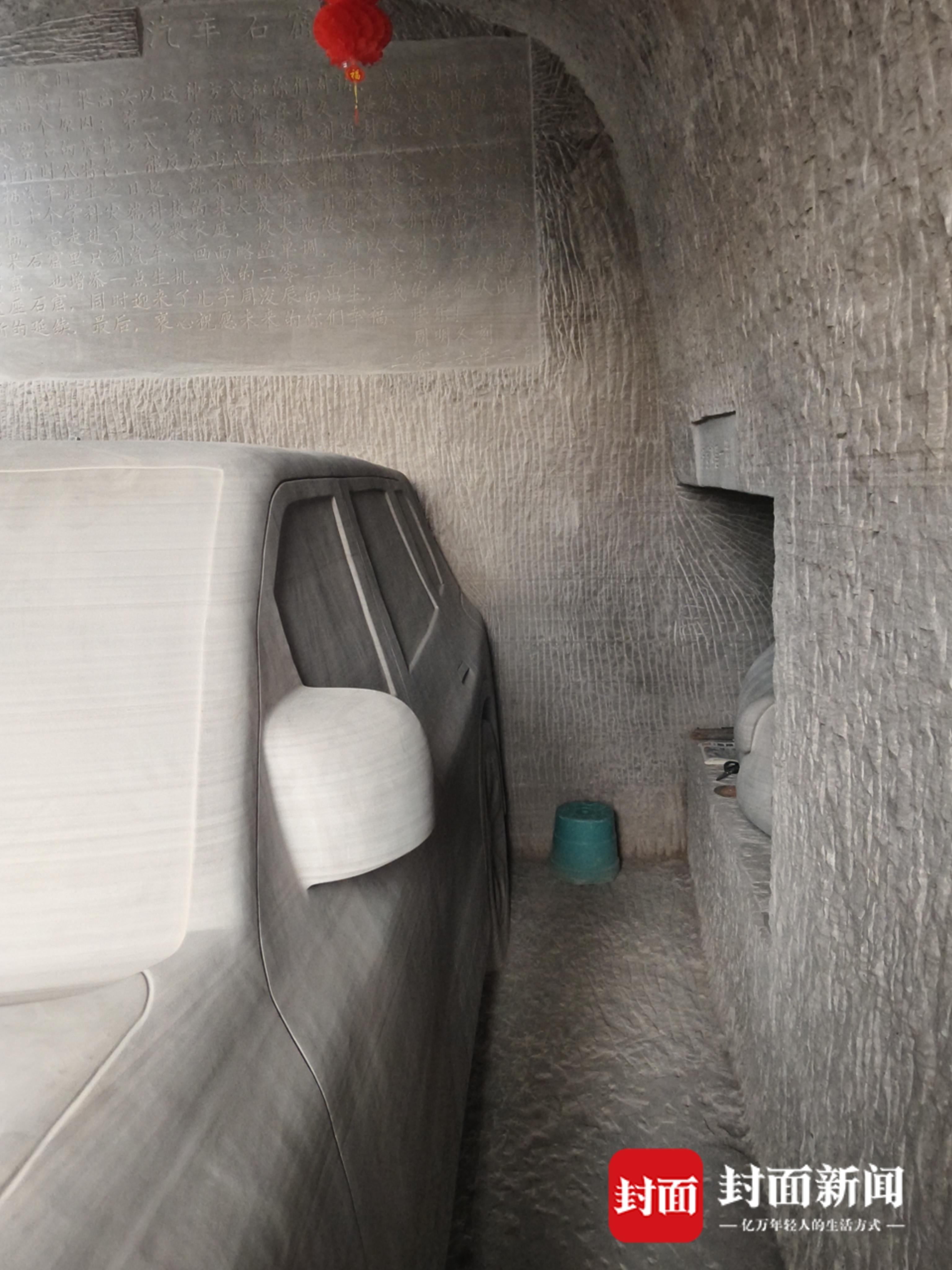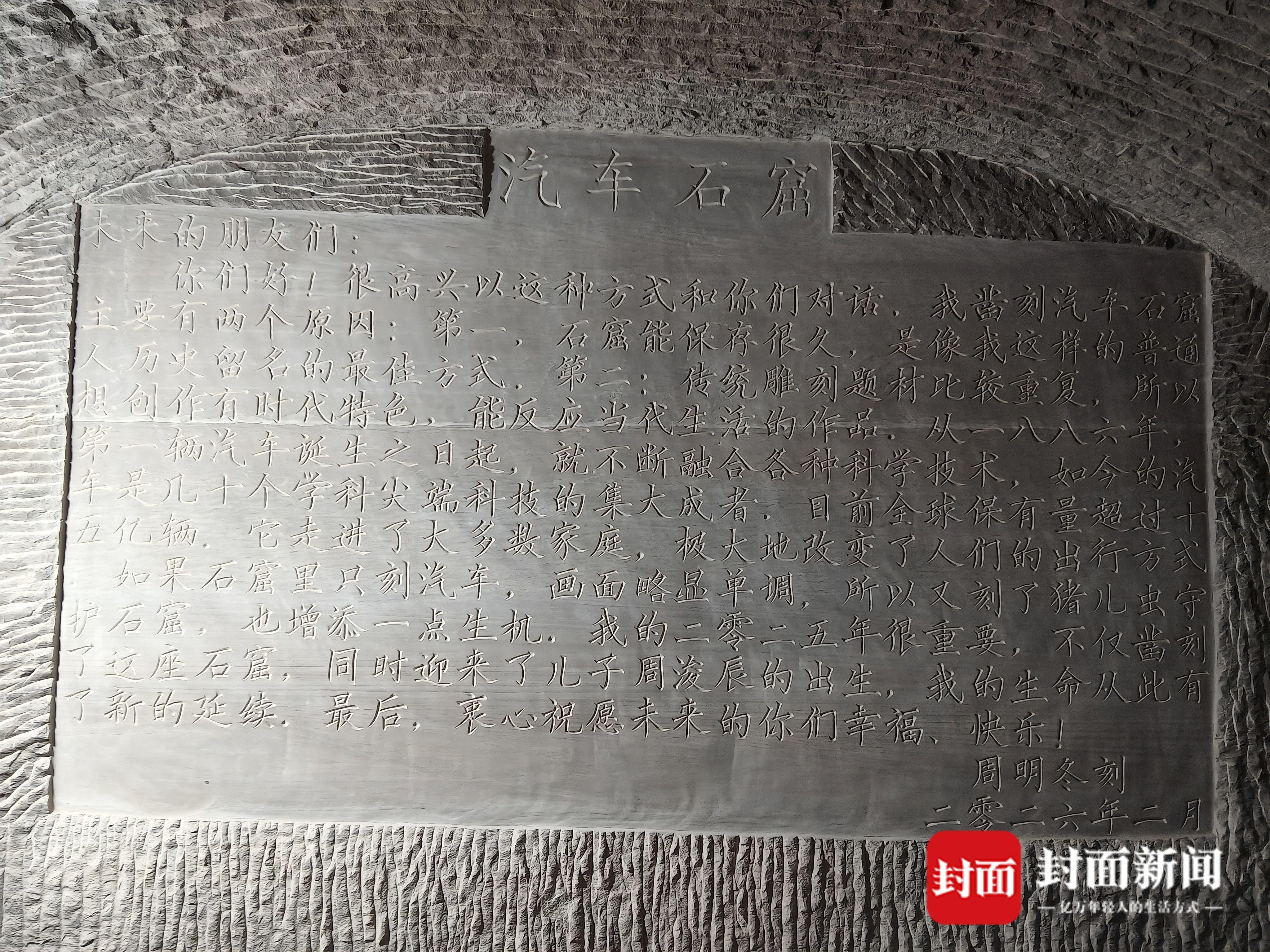 汽车石窟还藏着周明冬对家人的心意。改造期间,儿子正好出生,他特意在洞壁上刻下文字记录,希望以此作为送给孩子的特殊礼物。