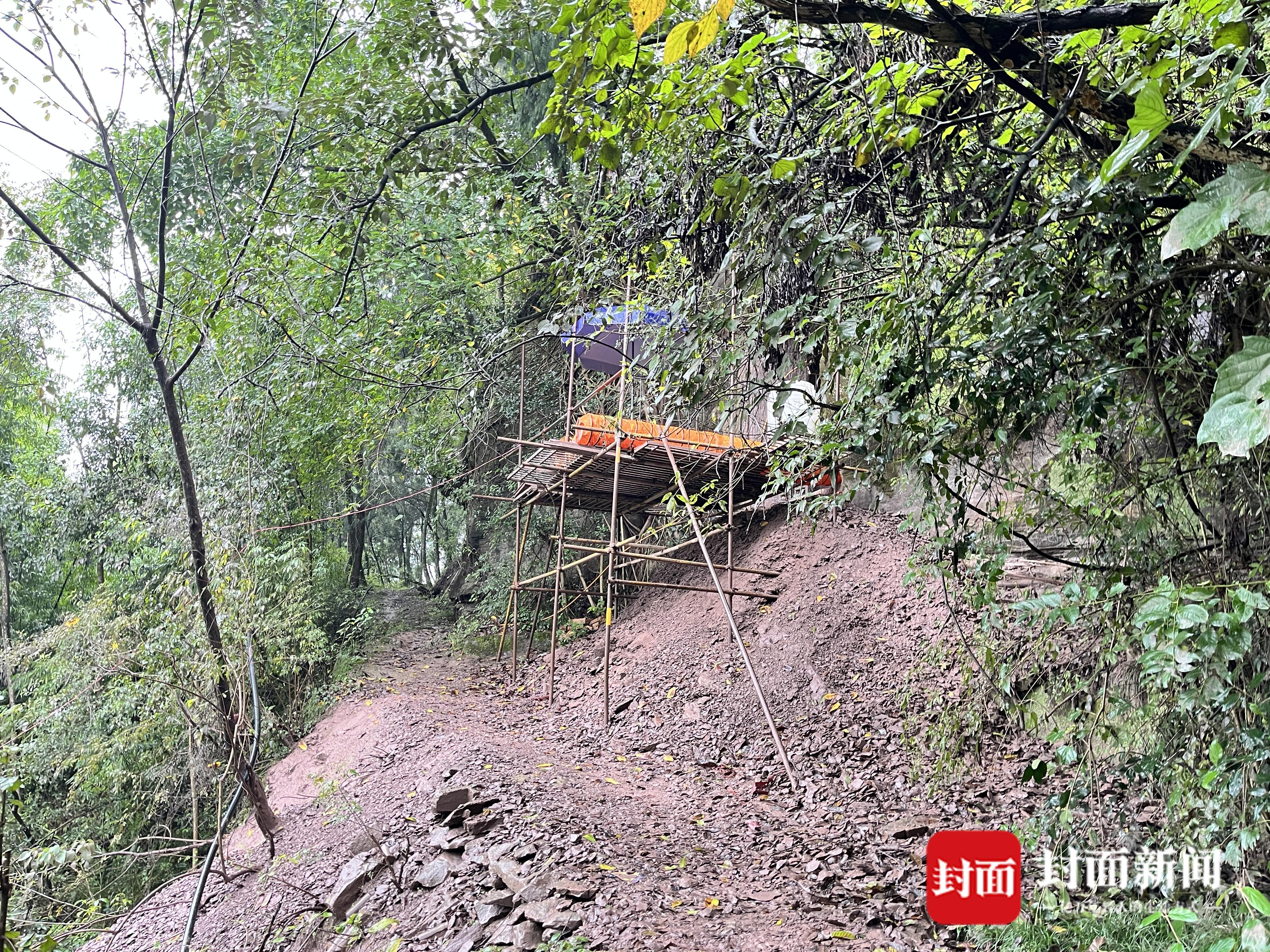 在跟着老师学习石刻几个月后,2025年6月,在征得同意后,周明冬带着一把电锤钻进了邻居家的林地。这里的崖壁距他家直线距离仅几十米,旁边还长着一棵黄桷树,成了他眼中“适合留下点东西”的起点。