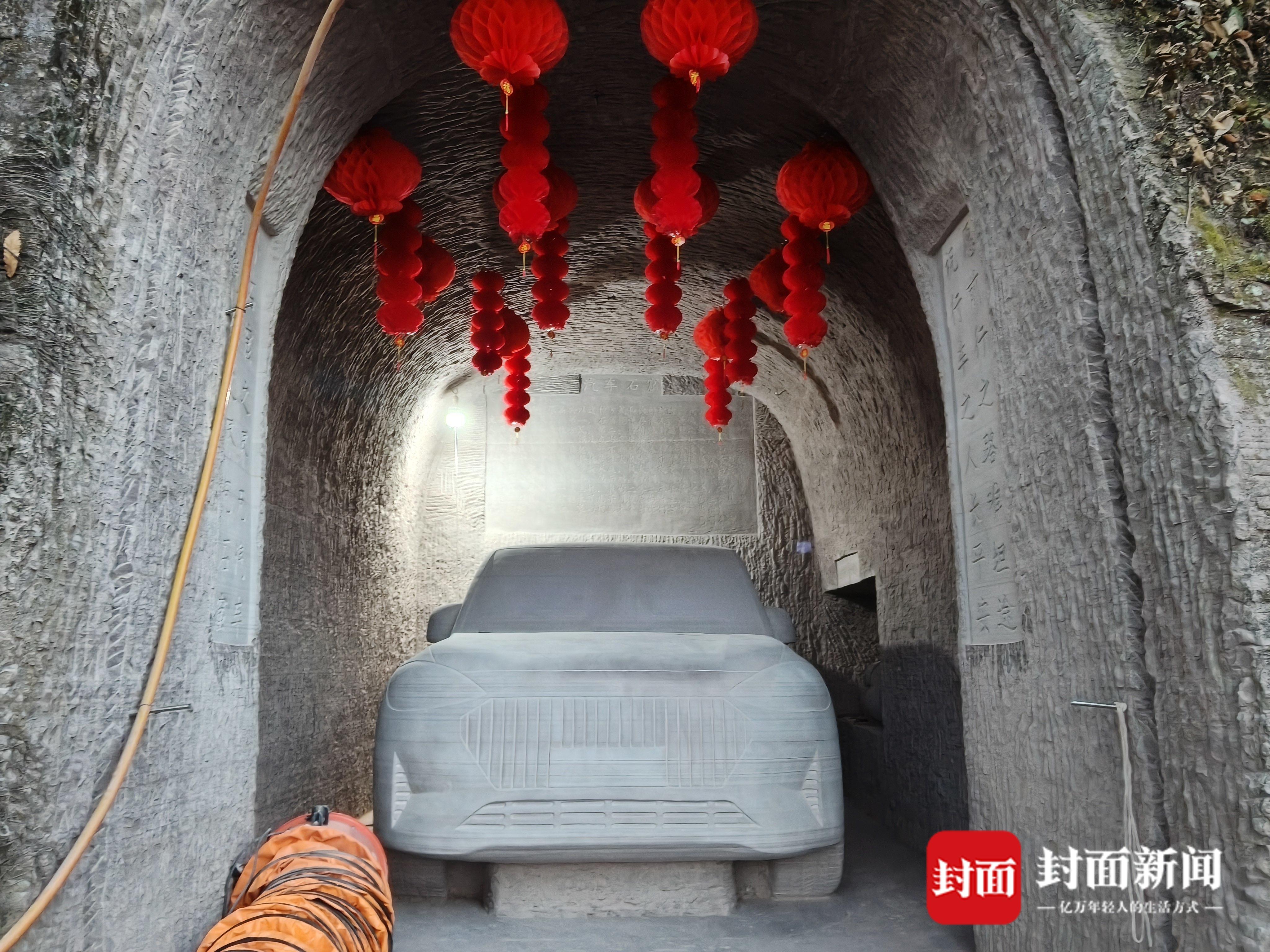 从夏天到冬天,洞口黄桷树的叶子从绿到黄,周明冬日复一日在洞内工作,最终一辆中大型SUV轮廓的汽车石刻在马年春节完工,其高1.7米、宽1.95米,长约4.6米,为契合摩崖石刻特点,周明冬特意将车尾最后30公分与石壁相连,未做单独雕刻。